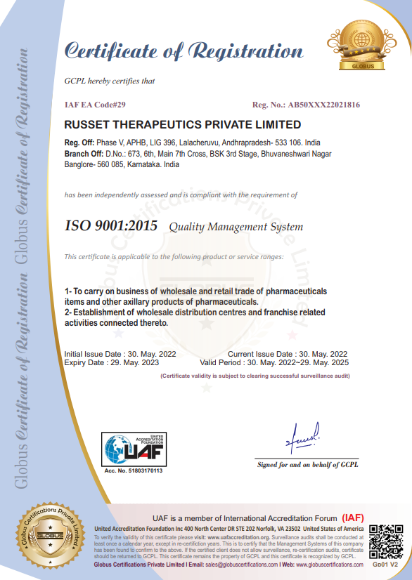 Our Products are manufactured according to International Standards (WHO – cGMP Certified) in selected and inspected high tec manufacturers. Presently we have five contract manufacturers who are manufacturing our branded formulations at various sites all over India. At Russet Therapeutics we evolve products.